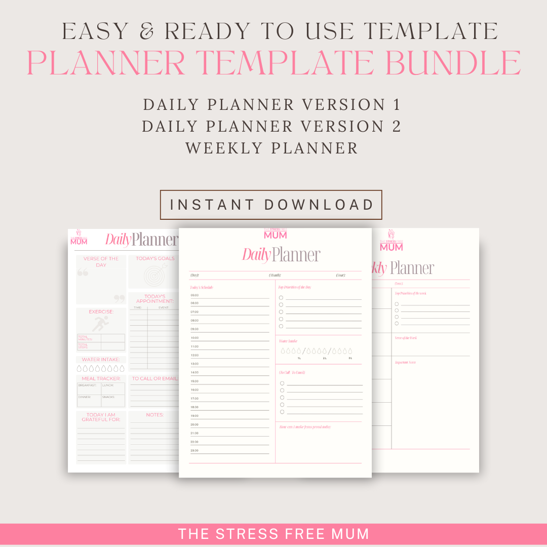 This bundle consists of 3 templates: Daily Planner version 1, Daily Planner version 2, and Weekly Planner.